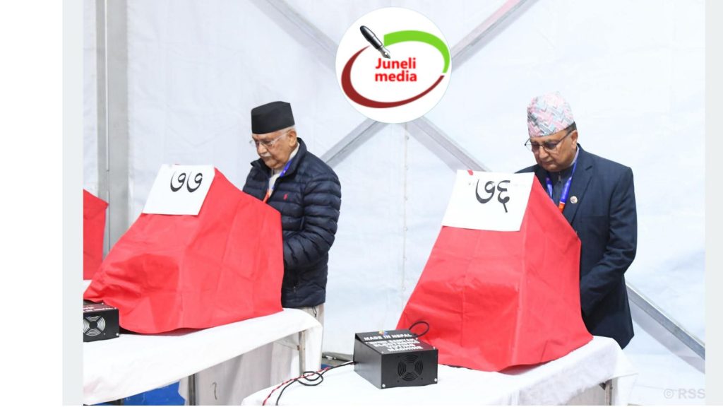 अध्यक्ष पदका दुई दावेदार ओली र पोखरेल मतदान गर्दै