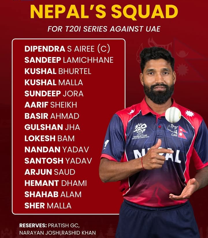 नेपाल क्रिकेट संघ (CAN) ले युएई (UAE) विरुद्धको आगामी दुई खेलको टी-२० आई (T20I) शृङ्खलाका लागि १५ सदस्यीय टोली घोषणा गरेको छ। यो शृङ्खलाका लागि नेपालले कप्तान परिवर्तन गर्दै आक्रामक अलराउन्डर दीपेन्द्र सिंह ऐरीलाई टोलीको नेतृत्व सुम्पिएको छ। टोलीमा कुशल भुर्तेल, कुशल मल्ल, सन्दीप जोरा, आरिफ शेख, बसिर अहमद, गुल्सन झा र लोकेश बम जस्ता अनुभवी ब्याटरहरू रहेका छन्। बलिङतर्फ सन्दीप लामिछानेले नेतृत्व गर्नेछन् भने उहाँलाई साथ दिन नन्दन यादव, शाहब आलम र शेर मल्ल टोलीमा छन्। यसपटक युवा खेलाडीहरू सन्तोष यादव र हेमन्त धामीले पनि टोलीमा स्थान बनाएका छन् भने अर्जुन साउदले लामो समयपछि पुनरागमन गरेका छन्। नियमित कप्तान रोहित पौडेललाई यस शृङ्खलाका लागि आराम दिइएको छ, तर उनले त्यसपछिको एकदिवसीय (ODI) खेलमा भने कप्तानी गर्नेछन्।