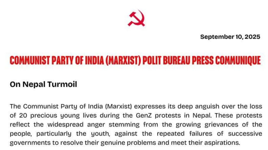 काठमाडौं, २५ भदौ (सेप्टेम्बर १०, २०२५) – भारतको कम्युनिष्ट पार्टी (मार्क्सवादी) (CPI-M) ले नेपालमा जारी GenZ आन्दोलनका क्रममा २० जना युवाको ज्यान गएको घटनाप्रति गहिरो दुःख प्रकट गरेको छ।
